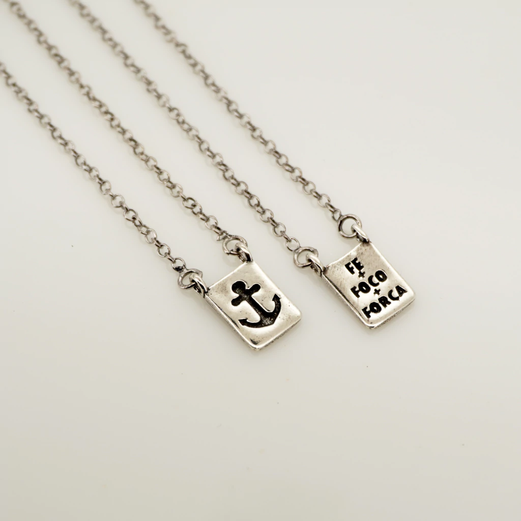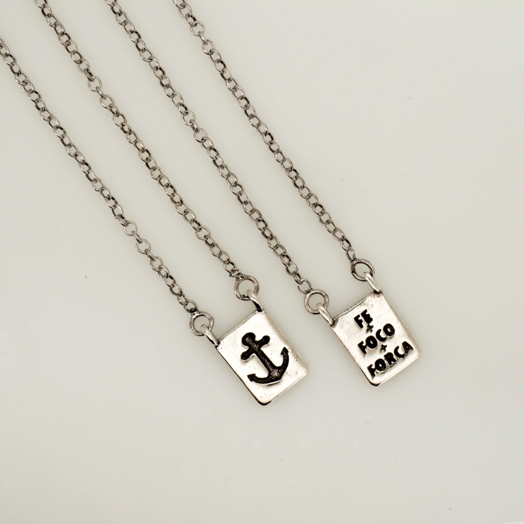 Expresse sua fé e determinação com esse escapulário. Este acessório apresenta dois pingentes simbolizando força e perseverança: um com uma âncora, representando estabilidade e esperança, e outro com a inscrição "Fé, Foco + Força", reforçando a importância de manter-se firme em seus objetivos.