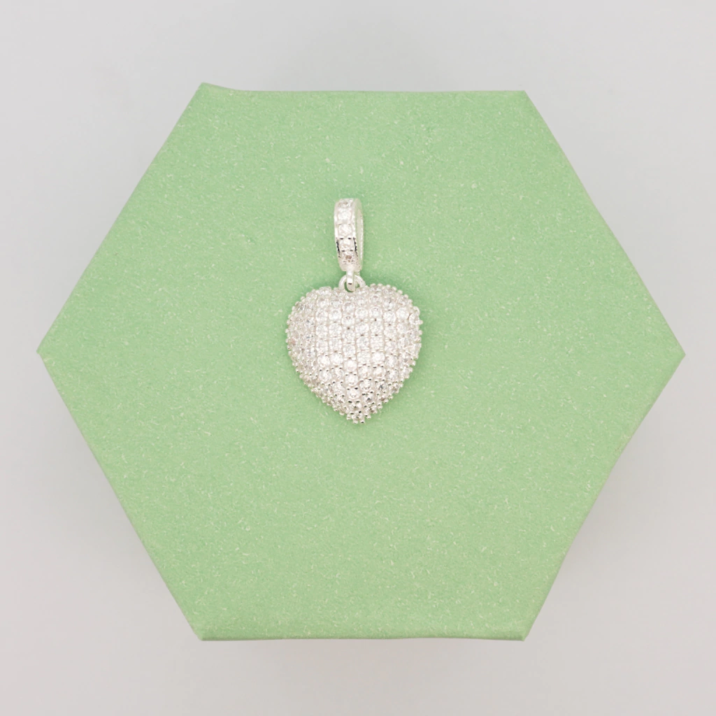 Elegante e atemporal, este pingente em formato de coração é cravejado com delicadas pedras que brilham em cada detalhe. Uma peça versátil que adiciona um toque de sofisticação e romantismo ao seu visual.