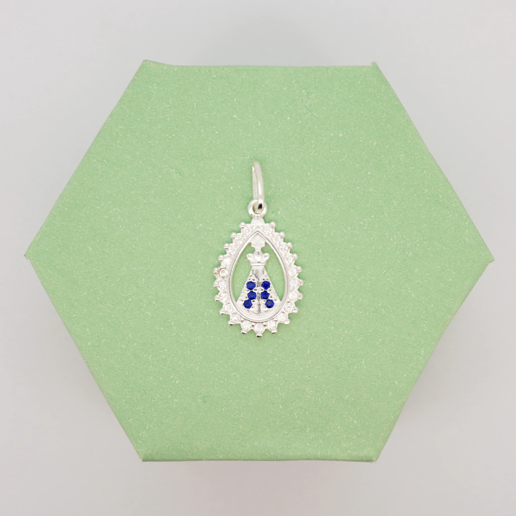 Delicado e cheio de significado, este pingente em forma de coração traz a imagem de Nossa Senhora em detalhes cuidadosamente trabalhados, cercada por pedras brilhantes que irradiam proteção e fé.