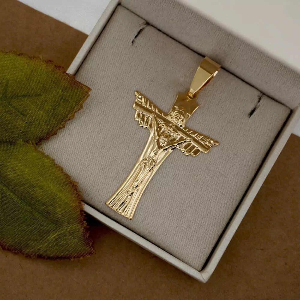 Uma peça única e cheia de simbolismo, este pingente apresenta Jesus crucificado esculpido em detalhes magníficos. É um acessório que expressa profunda fé e proteção divina.
