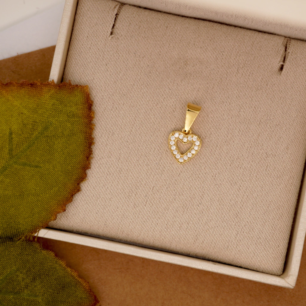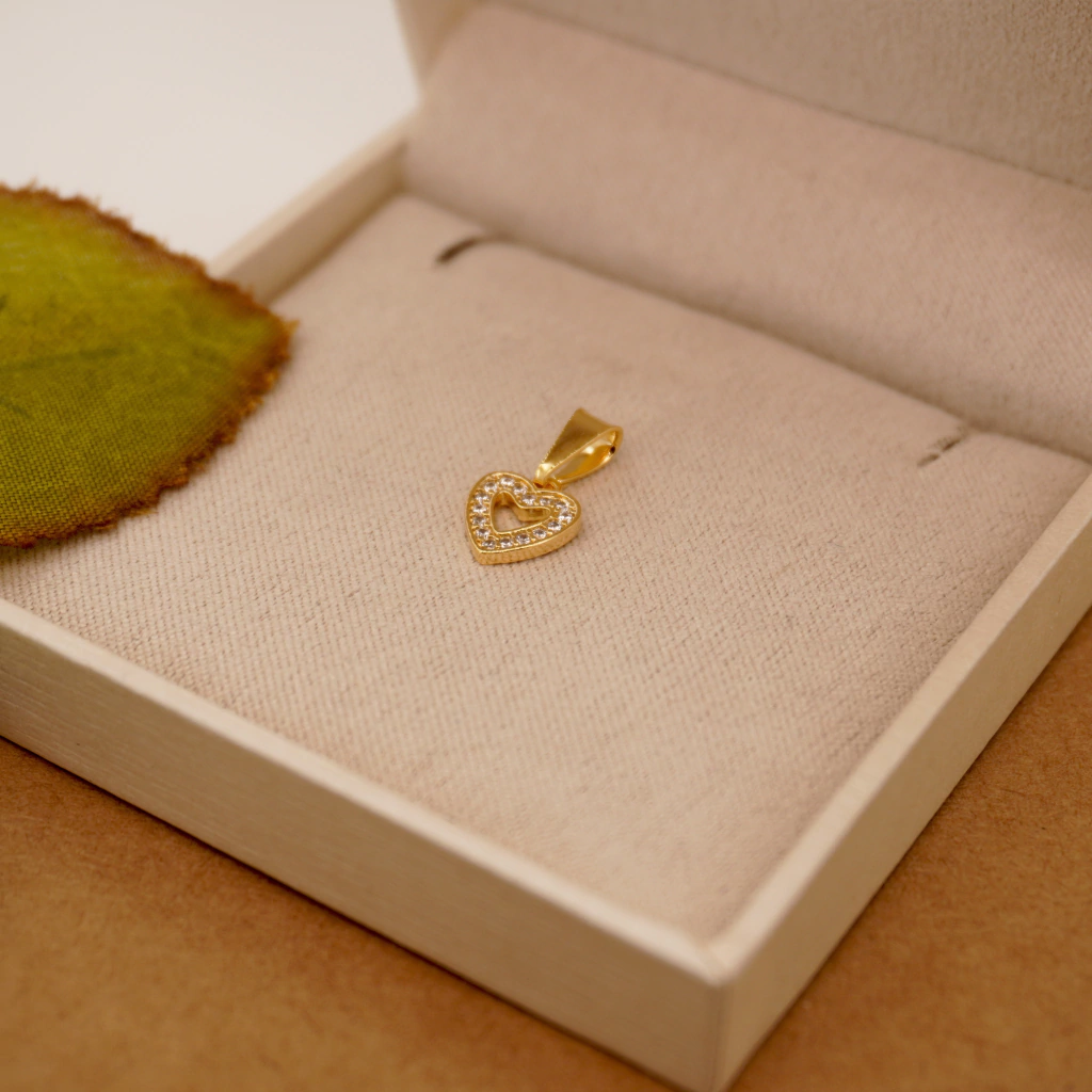 Elegante e atemporal, este pingente em formato de coração é cravejado com delicadas pedras que brilham em cada detalhe. Uma peça versátil que adiciona um toque de sofisticação e romantismo ao seu visual.