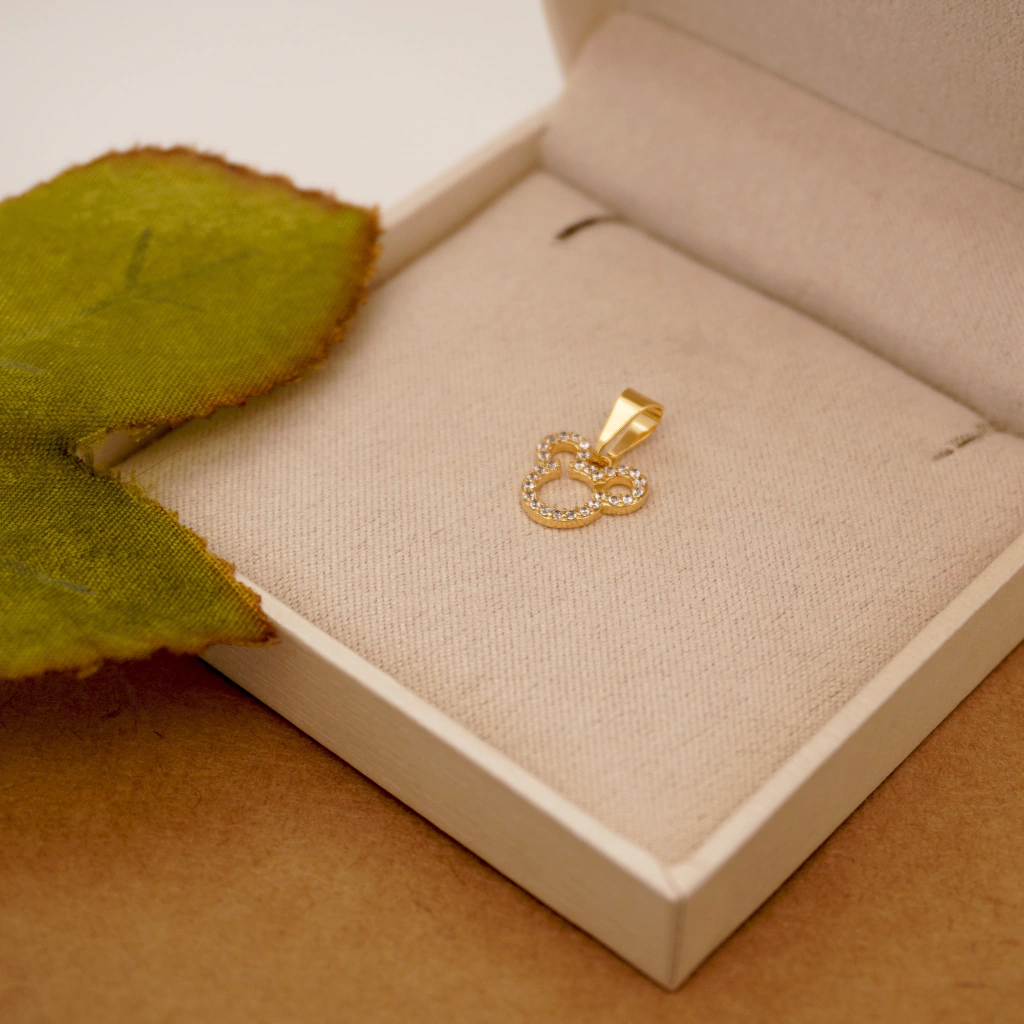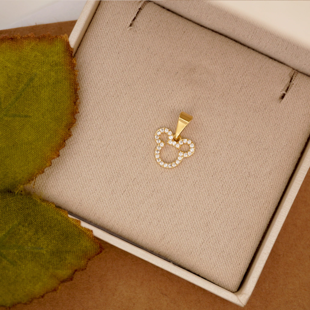 Encante-se com este pingente em formato de Mickey, repleto de pequenas pedras brilhantes que trazem um toque de brilho e charme. Ele é a escolha perfeita para adicionar um detalhe divertido e elegante ao seu look.